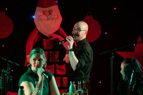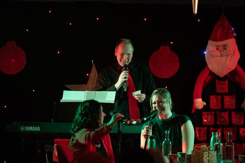 Bei Kerzenlicht und an festlich gedeckten Tischen werden Sie vorzüglich versorgt, während auf der weihnachtlich dekorierten Bühne ein übergroßer Adventskalender durch den Abend führt. Hinter jedem seiner 24 Türchen verbirgt sich ein Song, eine Geschichte, ein Gedicht, eine Interaktion mit dem Publikum.